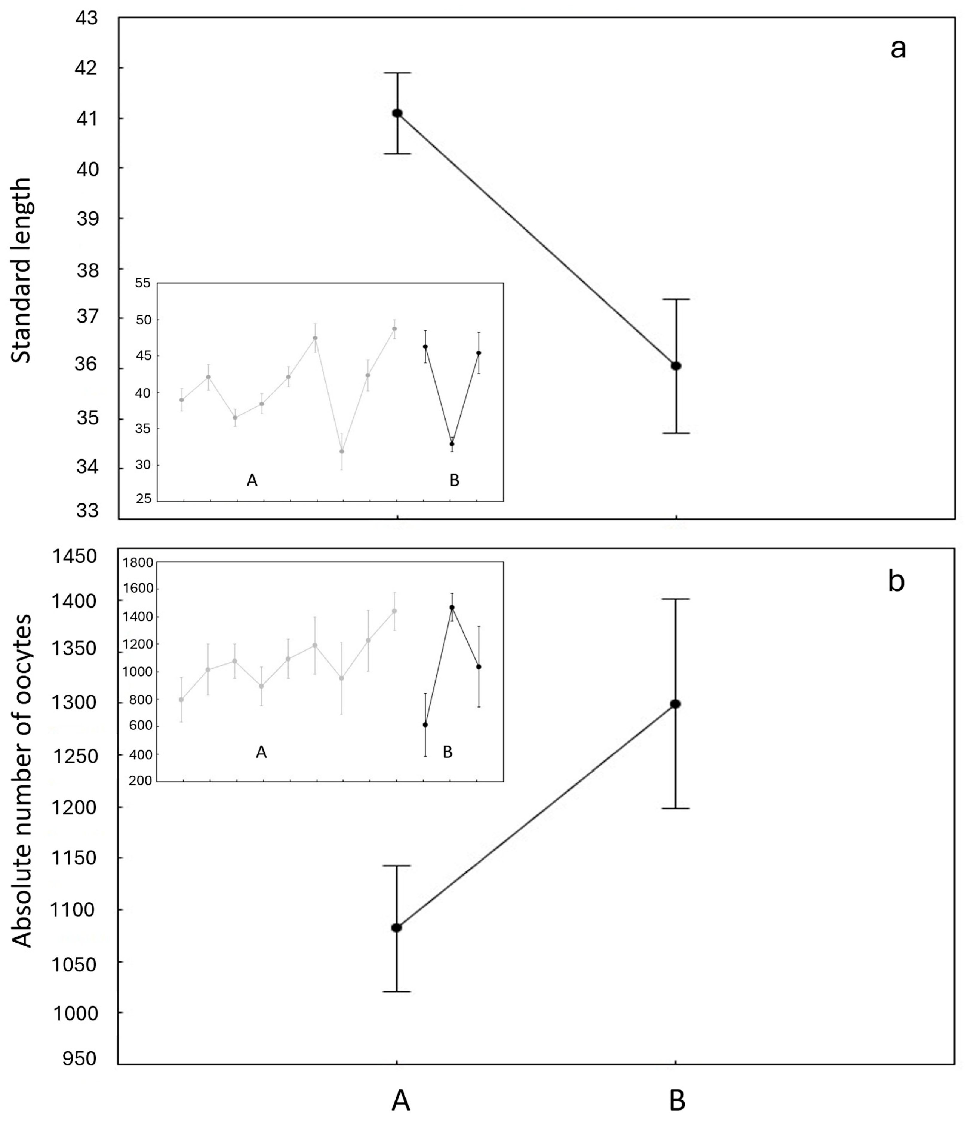 - Hôrková-Žitňanová, K.; Švolíková, K.; Haruštiaková, D.; Kováč, V. A New Approach to Evaluate Reproductive Traits in Batch-Spawning Fishes of Indeterminate Fecundity and Asynchronous Oocyte Maturation. Rev. Fish. Sci. Aquac. 2021, 29, 666–681. [Google Scholar] [CrossRef]