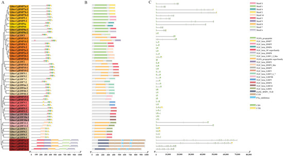 Conserved motifs, domains and exon-intron structures of the DVR genes in Qihe gibel carp. (A) Analysis of conserved motifs in the DVR protein sequence. Different conserved motifs are shown in specific colors. (B) Prediction of the DVR protein domain. (C) Gene structure of the DVR gene family. Note: The lengths of protein and DNA sequences were estimated using the scale at the bottom, and black lines represent non-conserved amino acids or introns.
