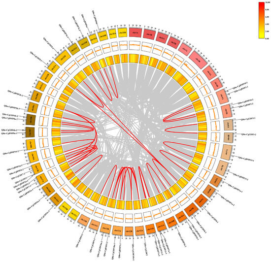 Self-collinearity analysis of DVR genes in Qihe gibel carp. Note: The outermost circle is the chromosome coordinates (Mb), chromosome number and gene distribution. Different colors represent different chromosome pairs. Followed by a gene density line graph, the innermost circle is the gene density heat map, red represents the high-density region, and yellow represents the low-density region.