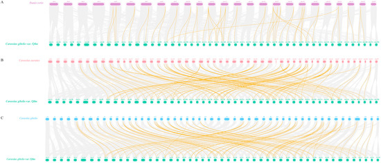 Collinearity analysis of DVR genes among the genomes of four species. (A) The collinearity between Qihe gibel carp and zebrafish. (B) The collinearity analysis of Qihe gibel carp and crucian carp. (C) The collinearity analysis of Qihe gibel carp and gibel carp.