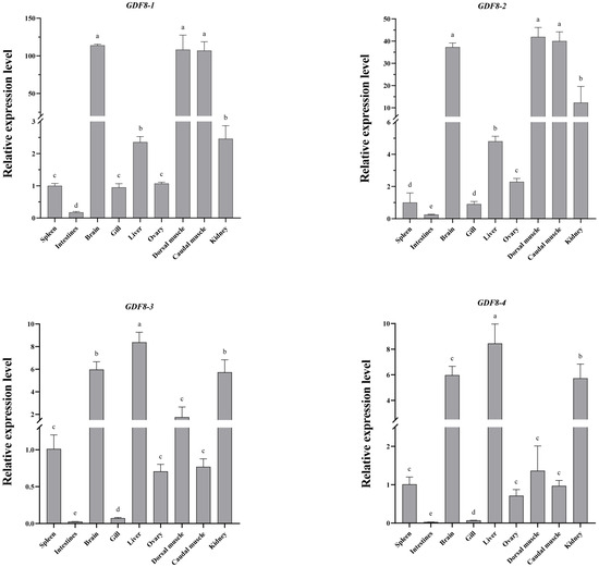 qRT-PCR analysis of the expression of the GDF8 gene in different tissues of the Qihe gibel carp. Note: Values with different letter superscripts mean significant difference (p < 0.05), while those with the same letter superscripts mean no significant difference (p > 0.05).