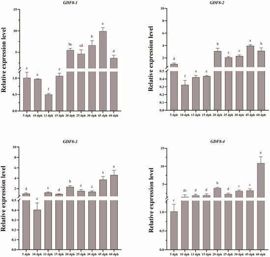 qRT-PCR analysis of the expression of the GDF8 gene in the Qihe gibel carp at different developmental stages. Note: Values with different letter superscripts mean significant difference (p < 0.05), while those with the same letter superscripts mean no significant difference (p > 0.05).