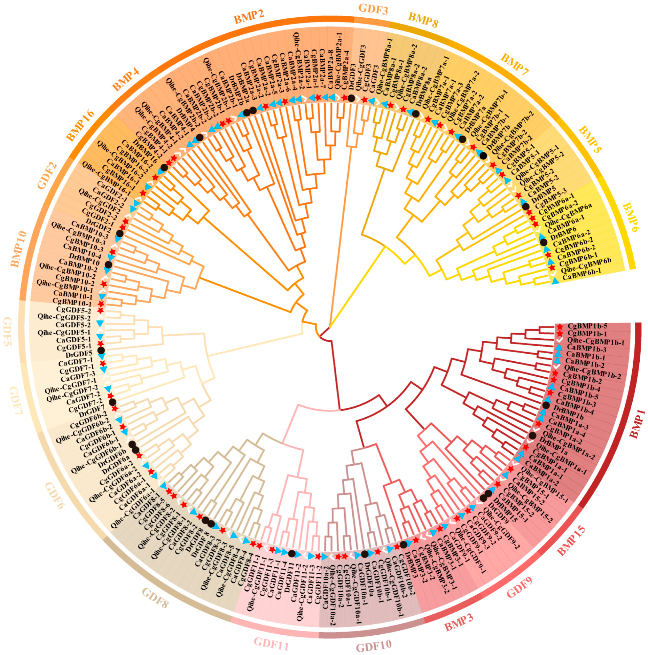 - Shi, R.; Li, X.; Xu, X.; Chen, Z.; Zhu, Y.; Wang, N. Genome-wide analysis of BMP/GDF family and DAP-seq of YY1 suggest their roles in Cynoglossus semilaevis sexual size dimorphism. Int. J. Biol. Macromol. 2023, 253 Pt 5, 127201. [Google Scholar] [CrossRef]