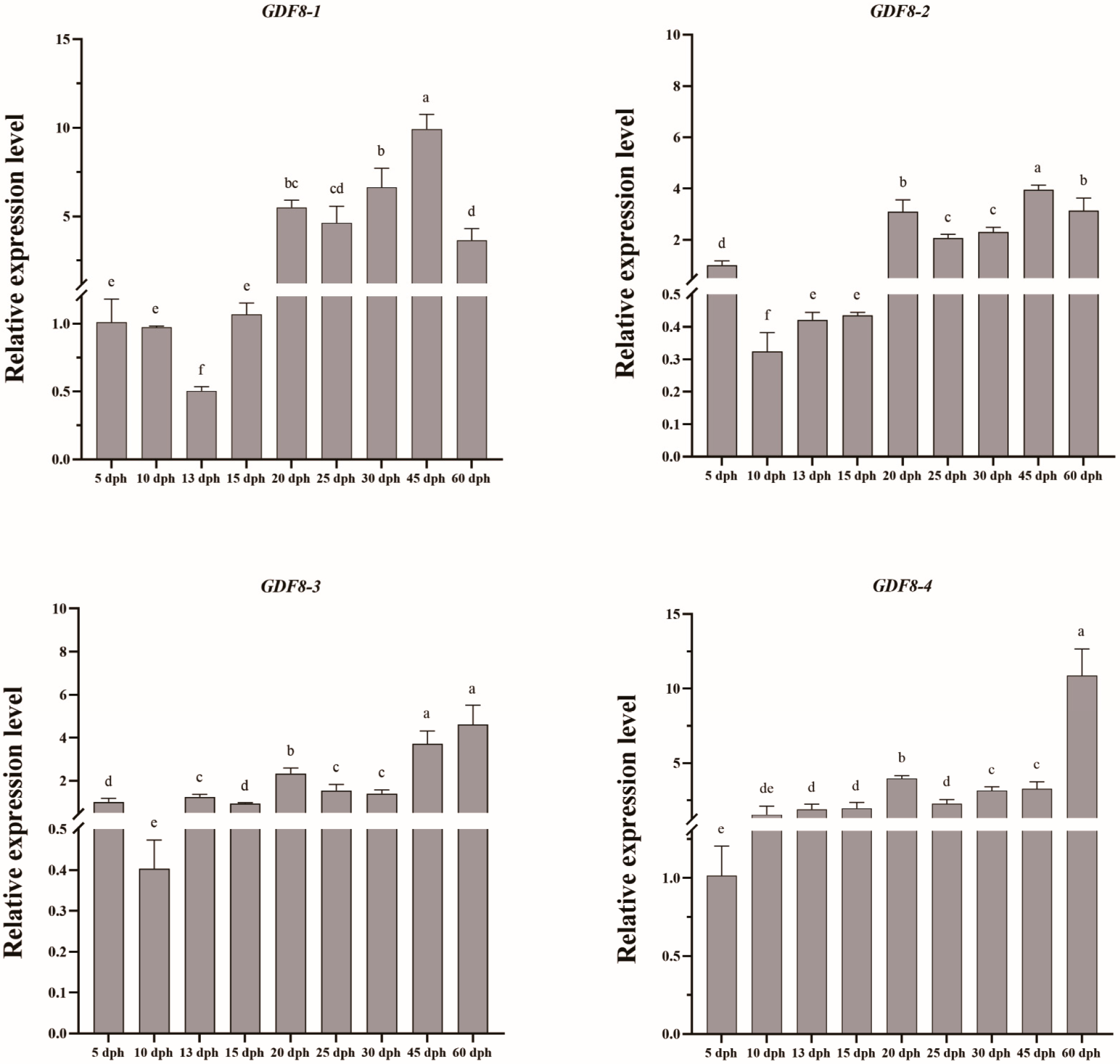 3.6. Spatio-Temporal Specific Expression of GDF8 Gene