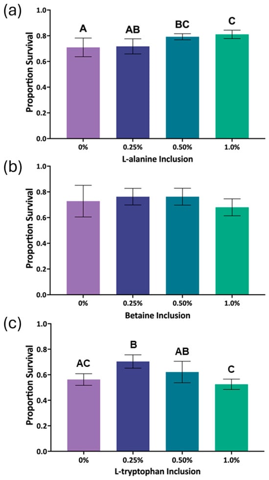 Artemia replacements (LAs). Larvae were fed MDs top-dressed with 0.25%, 0.50%, or 1.0% of L-alanine, betaine, or L-tryptophan for seven days. Diets with L-alanine and L-tryptophan significantly increased survival compared to the reference diet. A 21-day trial that tested three feed attractants combined into a single diet at previously determined inclusion levels (L-alanine, 0.5%; betaine, 0.25%; and L-tryptophan, 0.25%) showed no additive or synergistic survival benefits. No differences were observed for RNA/DNA ratios at 15 days post-hatch, suggesting no effect on larval quality. Additional experiments were conducted comparing the performance of two commercial LA diets (EZ Artemia Ultra [Zeigler Bros., Inc., Gardners, PA, USA] and LiquaLife