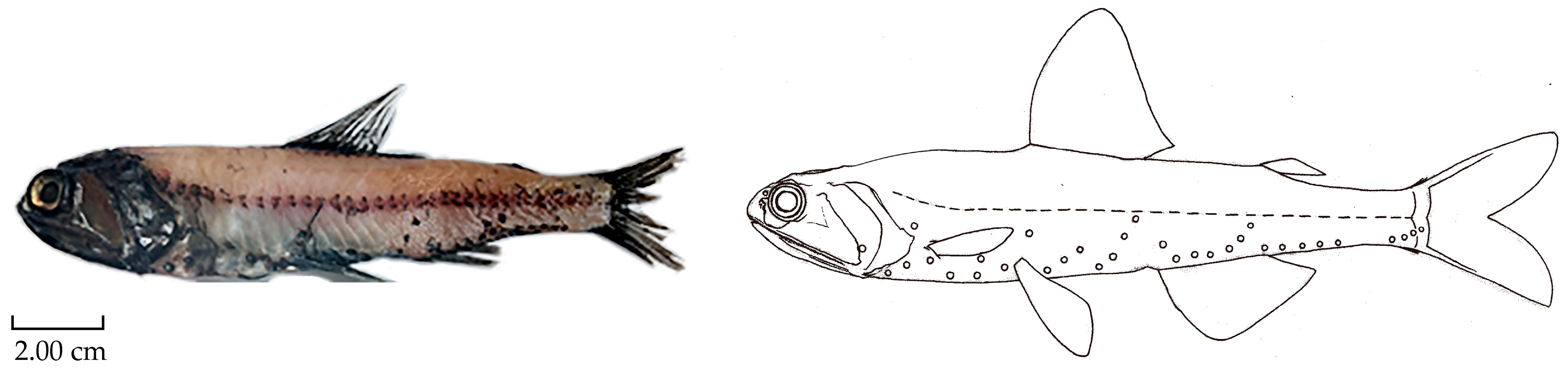 37. Karnella, C. Family Myctophidae, Lanternfishes. In Biology of Midwater Fishes of Bermuda Ocean Acre; Gibbs, R.H., Krueger, W.H., Eds.; Smithsonian Contributions to Zoology: Washington, DC, USA, 1987; Volume 452, pp. 51–168. [Google Scholar]