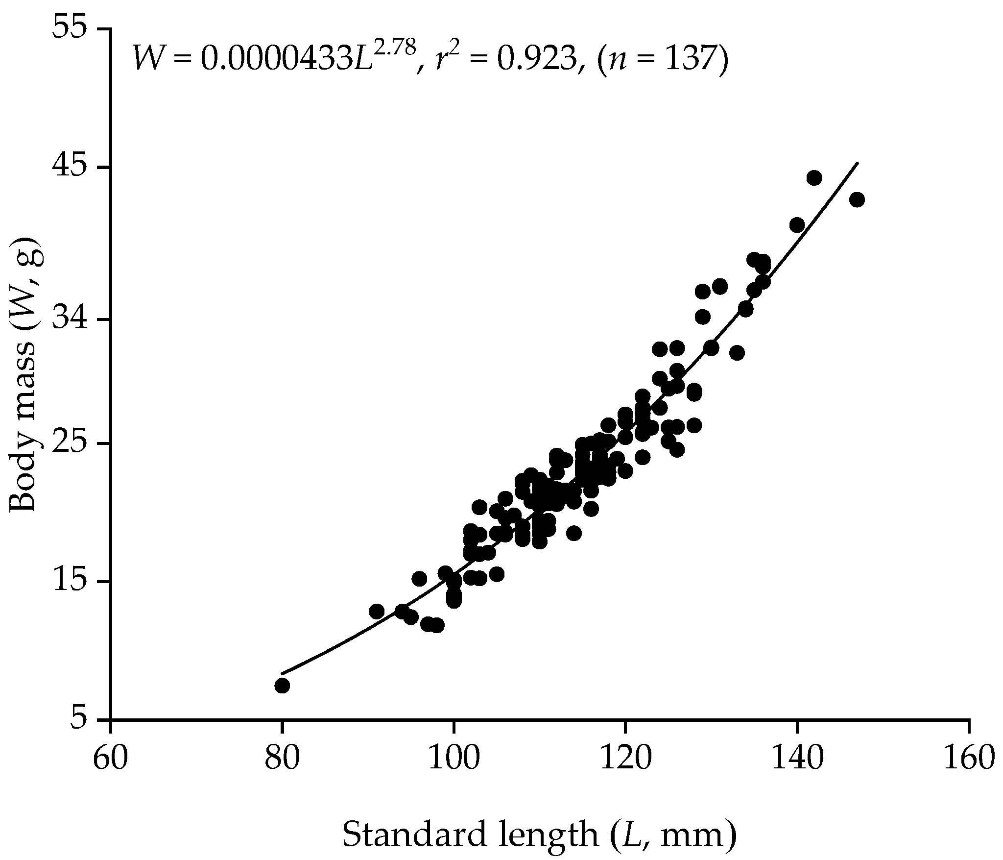 where W is body mass, L is standard length, a is the intercept, and b is the slope of the equation. Both a and b are obtained by transforming logarithmic expression (log W = log a + b·log L). The equidistant growth mode of the population is determined by b. That is: if b = 3, it is isometric growth; if b < 3, then negative allometric growth is denoted; if b > 3, it is positive allometric growth [31]. Determination of the ordinate was by the mean body mass of all specimens in the body length interval.