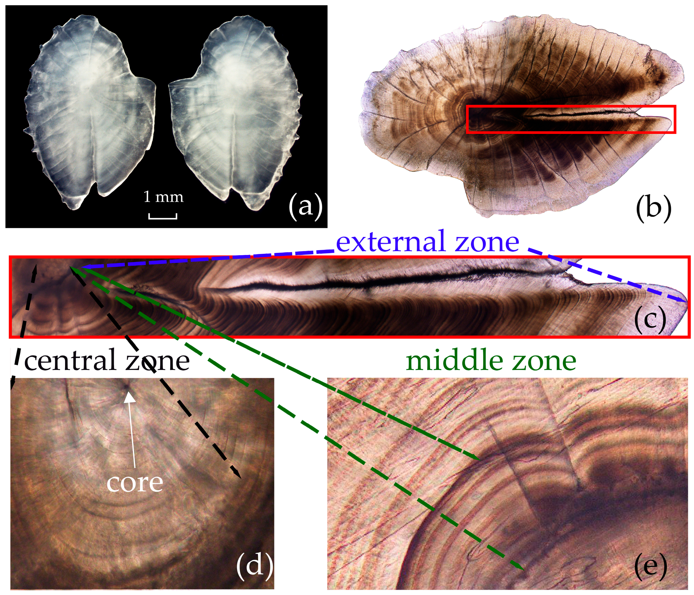 Otoliths are part of the inner ear of a fish. Otoliths are characterized by a stable chemical composition and a rigid structure. They have been applied widely in age determination. Otoliths are regarded to be the earliest calcified tissue formed during embryonic development in osteichthyans [23]. Following core formation, otolith growth proceeds through daily deposition of calcium carbonate and protein, producing continuous growth increments visible in frontal and sagittal sections [10,23]. The age of a fish is determined by counting the total number of daily growth increments in the otolith [23]. Among the three otolith pairs (lapillus, astericus, and sagitta), the sagitta is the largest and has been used effectively for age identification in lanternfishes [10,24,25]. The otolith microstructure of the sagittal otolith intuitively displays the daily growth increments, and the otolith is divided into distinct zones based on morphological differences between these increments [10,18,24,25,26,27].