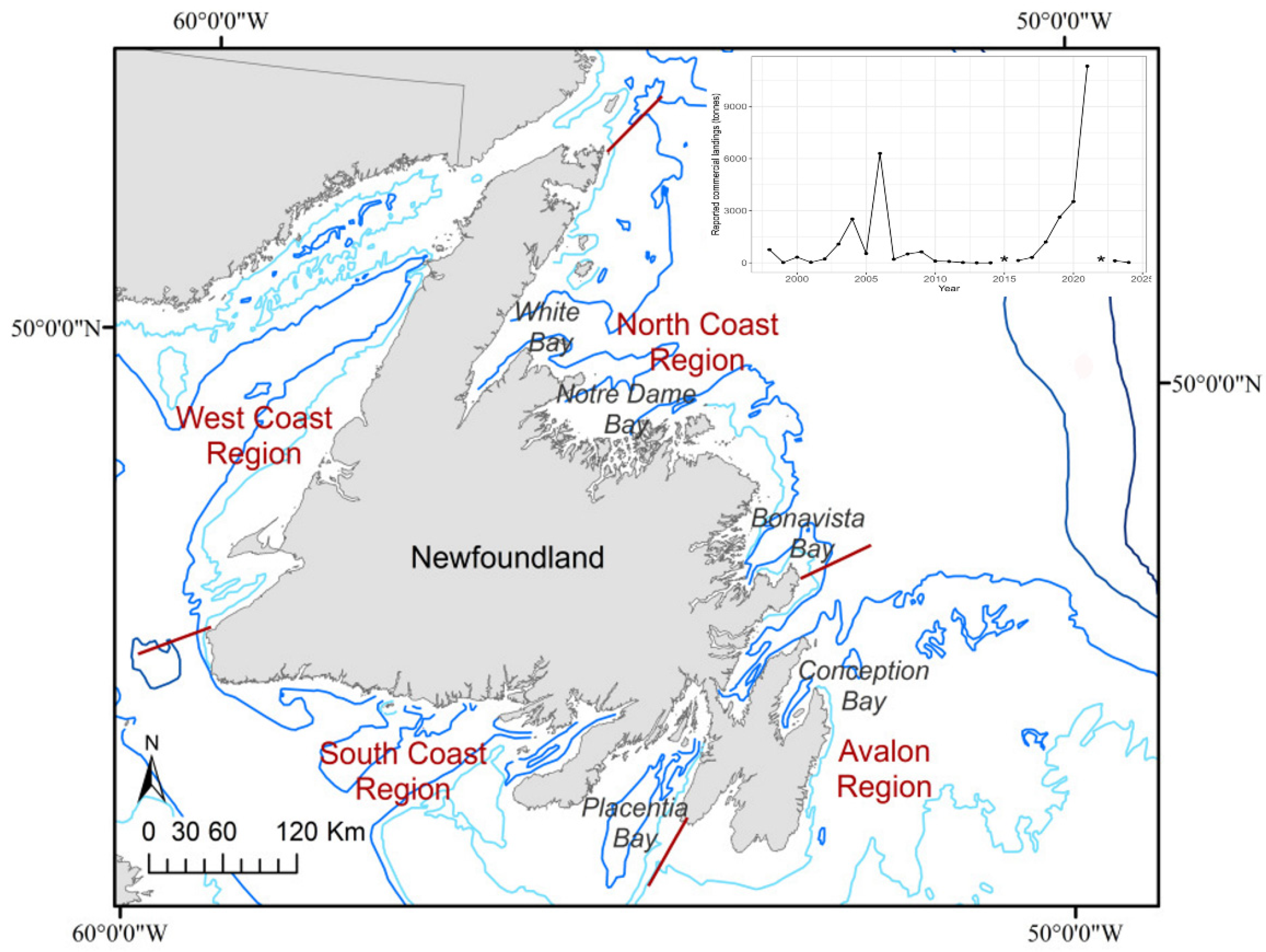 Longfin inshore squid migrate to coastal spawning grounds from the edge of the continental shelf off northeastern USA in the springtime (large individuals) and summer (smaller individuals) [,]. Off Canada, spawning grounds have been noted in the Bay of Fundy (August to September), the eastern coast of Nova Scotia (spring to late-summer), and the Scotian Shelf and Georges Bank (spring to late-summer) [,]. Although longfin inshore squid spawn year round [], these previously reported seasonal and geographic peaks, in combination with their timing within inshore waters off NL at the extent of their range in our surveys (August to October), highlight the need to evaluate catch composition of the recreational and commercial fisheries and further search for and document potential spawning grounds in this area.