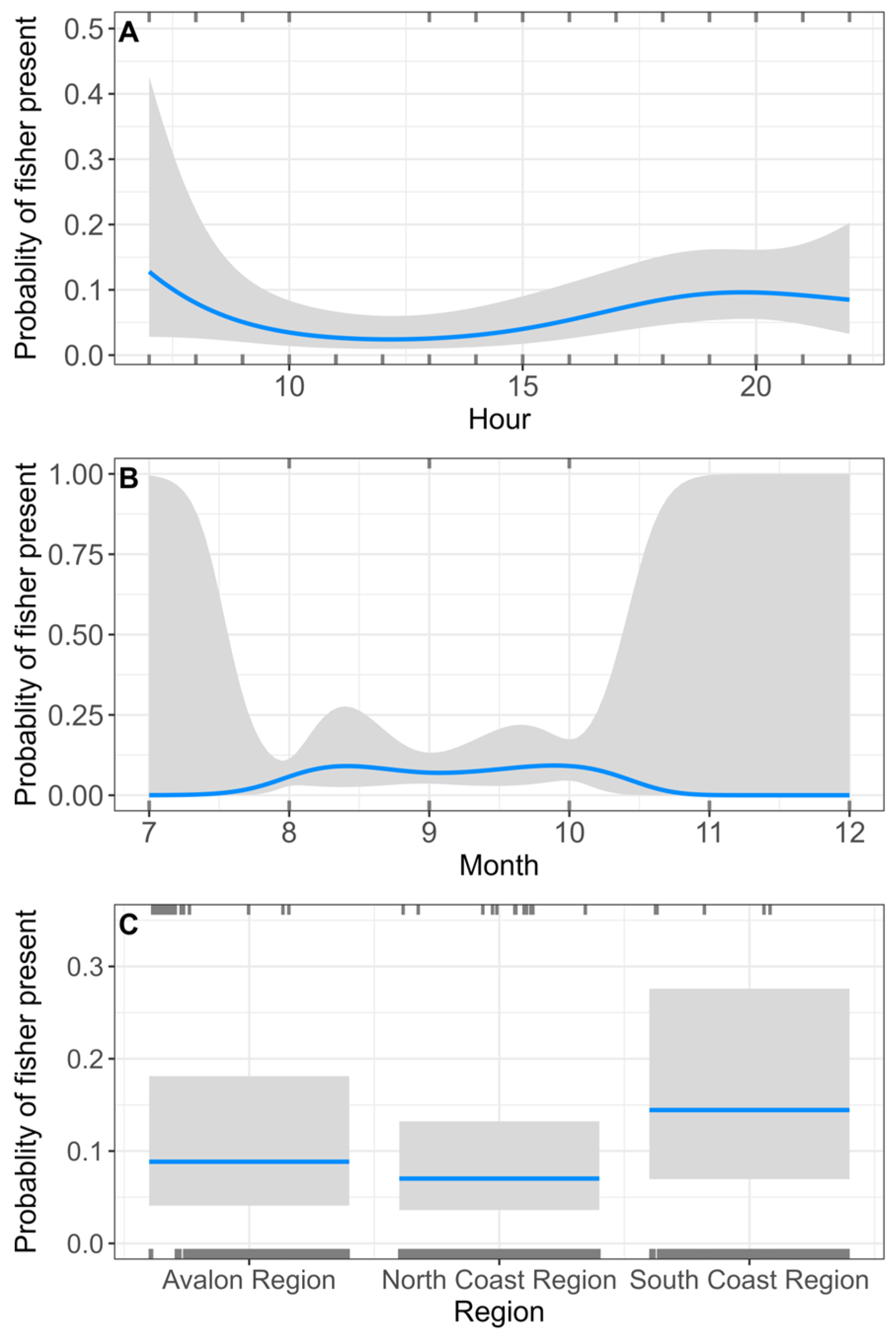 Dockside scans were more likely to note the presence of fishers in the evening hours (~20:00) or morning (~7:00) (p = 0.034), and in the South Coast Region (p = 0.004) (Figure 2). Although month was not deemed a significant covariate in the model predicting fisher presence (p = 0.599), its inclusion in the model significantly improved the AIC values (model with month AIC = 344.88, model without month AIC = 353.83). Overall, the model explained a relatively low percentage of deviance (10.1%).
