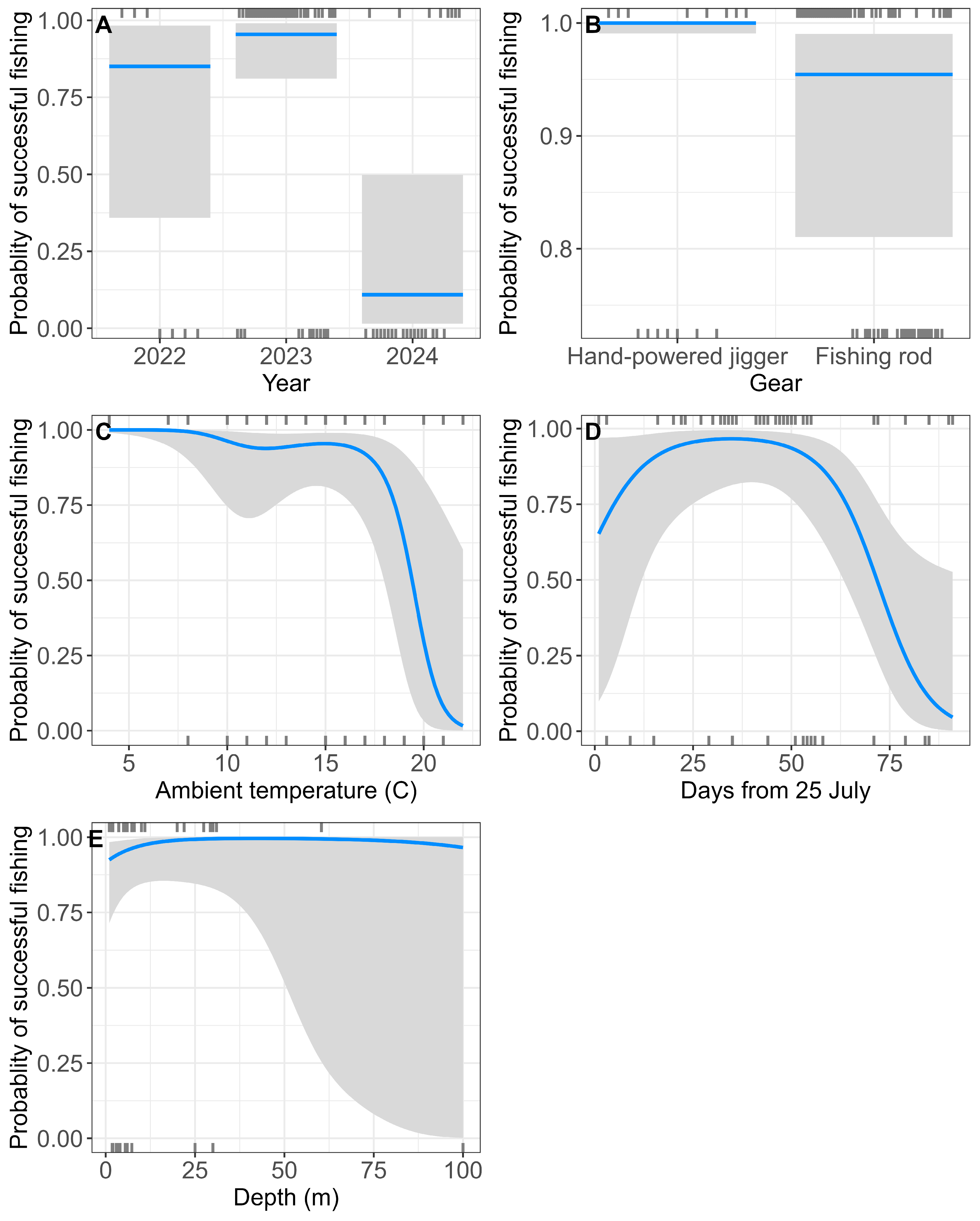 Partial effect plots from a general additive model (GAM) predicting the probability of a successful fishing trip (i.e., at least one squid landed) as reported in the Squid Recreational Fishing Survey, based on (A) year, (B) gear, (C) ambient temperature (°C), (D) number of days from first recorded recreational fishing trip (25 July), and (E) depth (m). The grey shaded area represents the 95% confidence interval for the fitted smooth function.