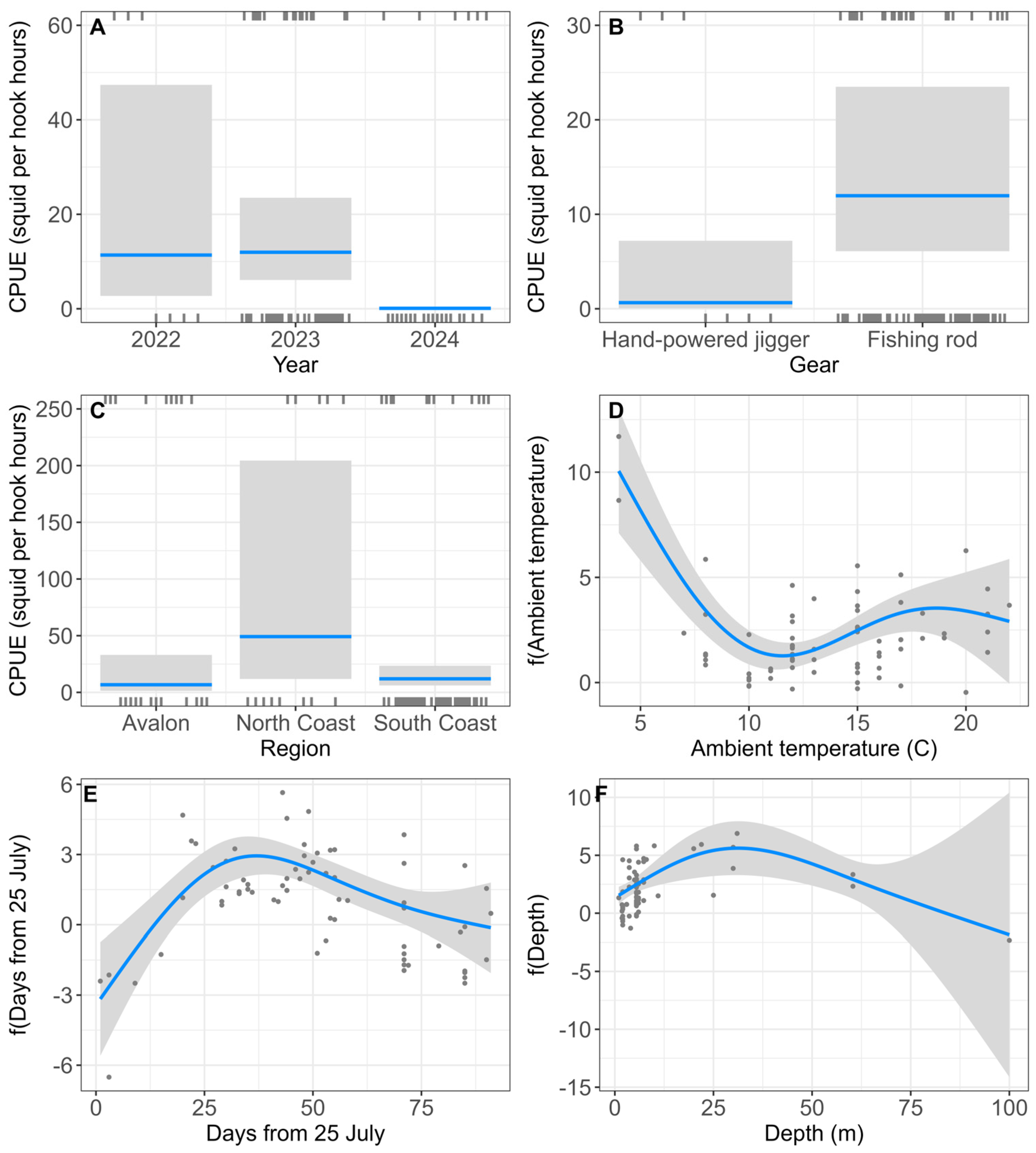 Partial effect plots from a general additive model (GAM) predicting catch per unit effort (number of squid per hook hours fished) as reported in the Squid Recreational Fishing Survey from 2022 to 2024, based on (A) year, (B) gear, (C) region in Newfoundland and Labrador, Canada, (D) ambient temperature (°C), (E) number of days from first recorded recreational fishing trip (25 July), and (F) depth (m). Ambient temperature, number of fishing days, and depth were reported as functional responses for ease in viewing. The grey shaded area represents the 95% confidence interval for the fitted smooth function.