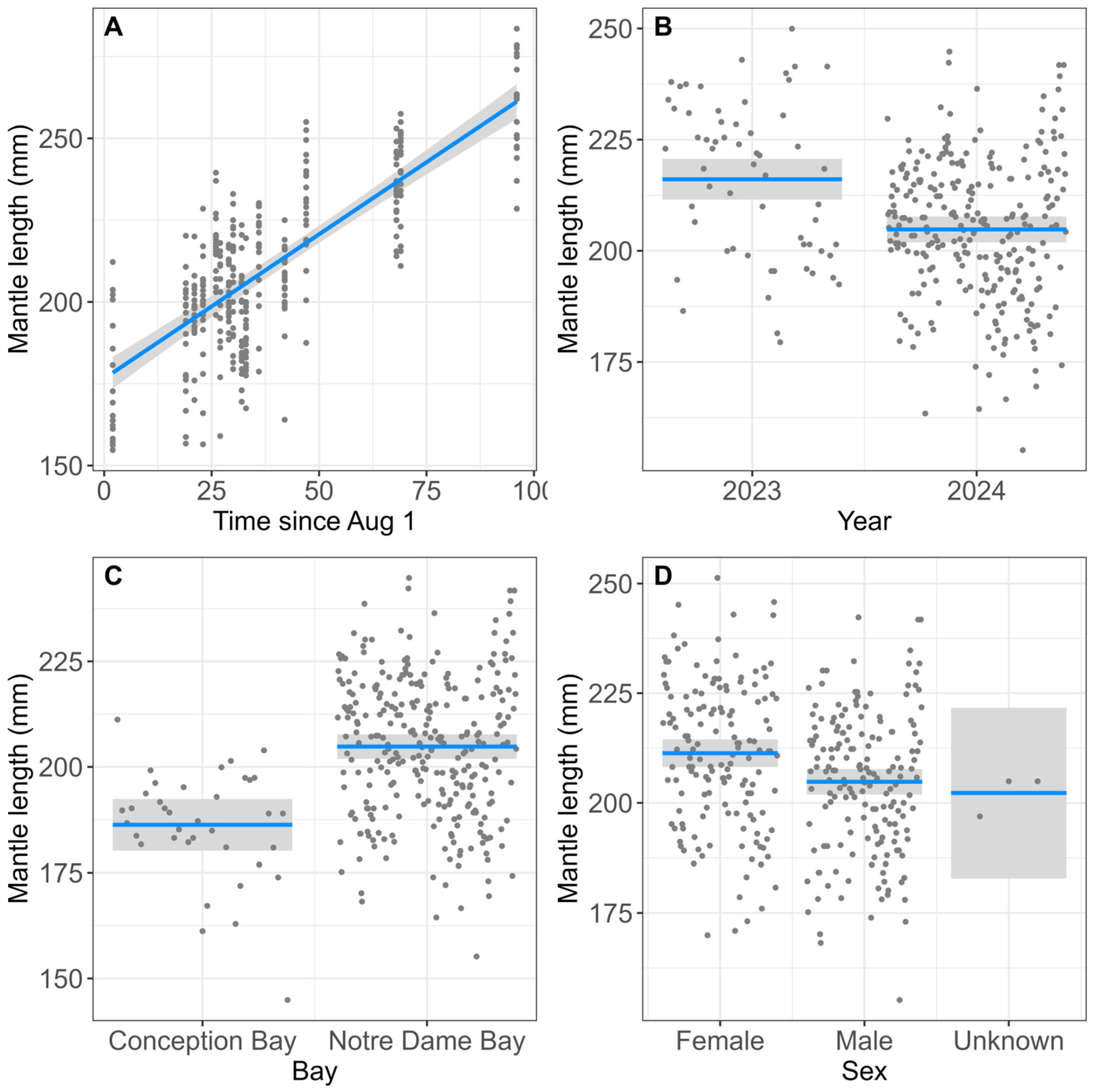 Numerous recreational and commercial harvesters participated in the survey/logbooks and provided valuable data for our research. The fieldwork was completed by various DFO staff, including M. Hurley, B. Nolan, J. Costello, and K. Antaya. In addition, J. Sitland, B. Stevenson, and R. Critch were instrumental in helping to promote the recreational survey throughout Atlantic Canada. M. Hurley processed squid collected by commercial index harvesters. We thank the three anonymous reviewers for their helpful suggestions to improve our manuscript.