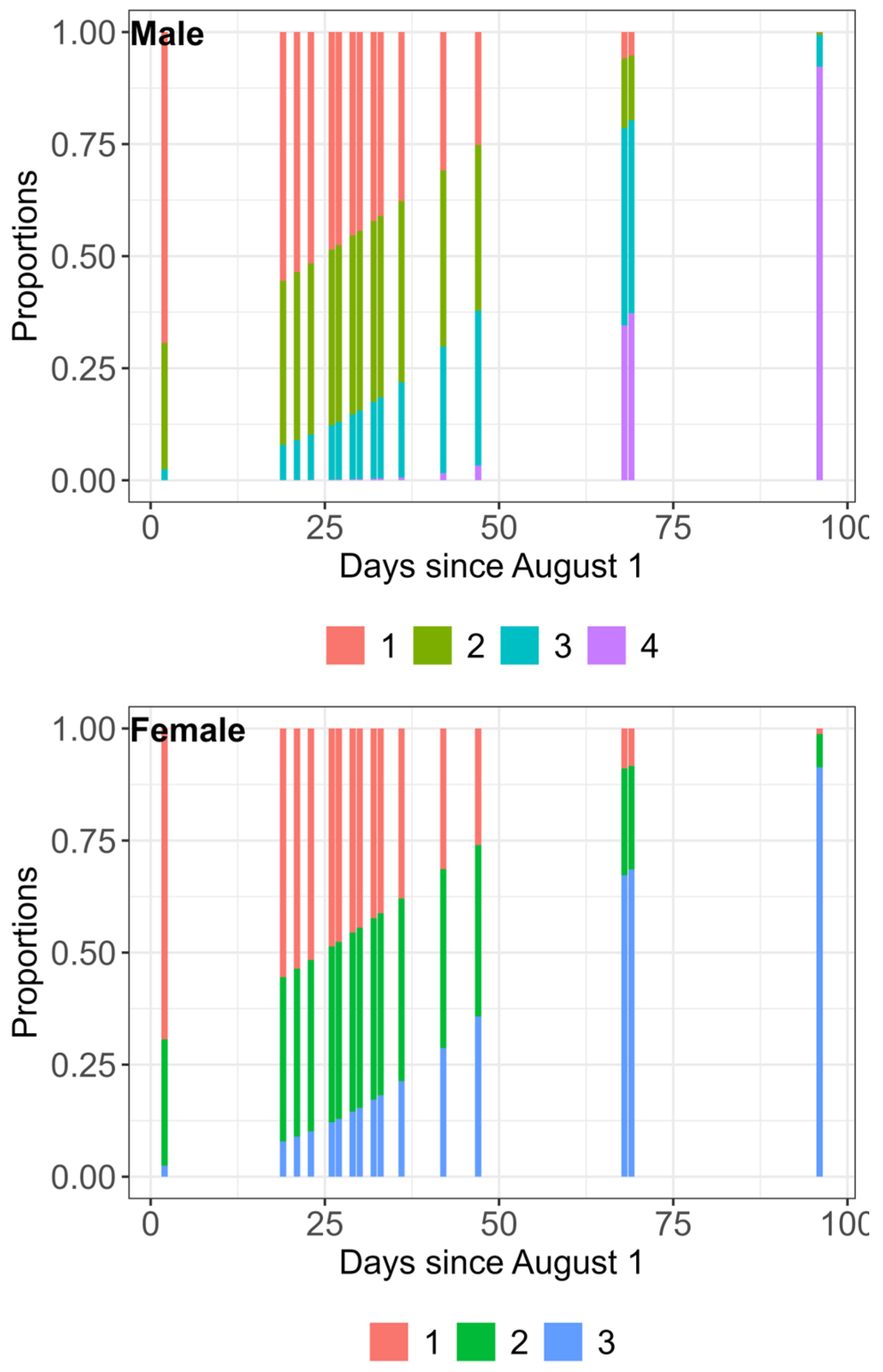Predicted maturity stages (colours) of male and female northern shortfin squid (Illex illecebrosus) in relation to days since 1 August from a multinomial model based on samples collected from commercial index harvesters off the island of Newfoundland, Canada (2023 and 2024).