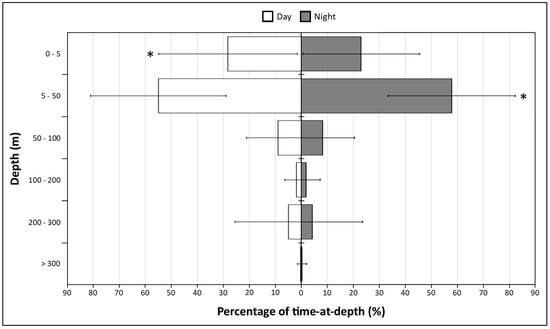 Diel distribution of the time spent at maximum depth, among depth ranges, by reef manta rays (Mobula alfredi) (n = 19) recorded using pop-up satellite tags (SPLASH10 and MiniPAT) in New Caledonia. * indicates significantly higher average.