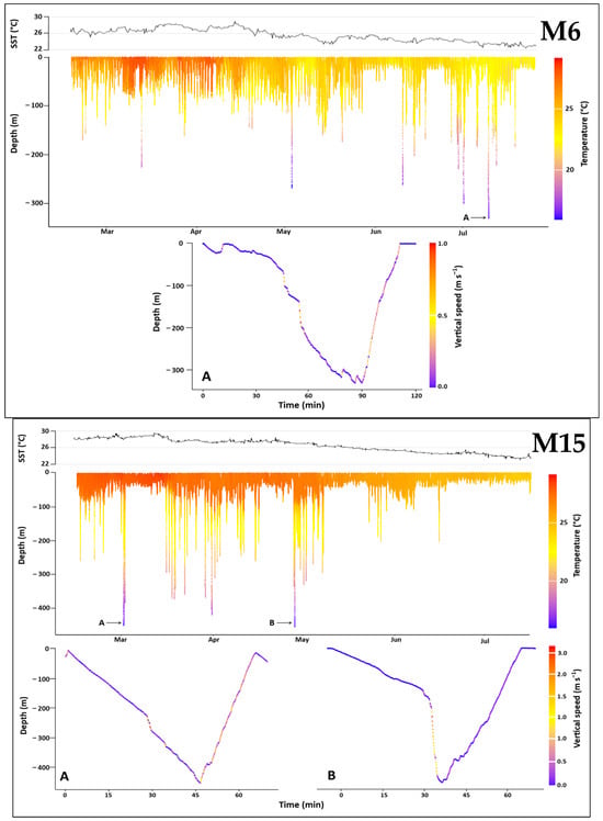 The analysis of the deepest dives performed by the three individuals revealed similar V-shaped dive profiles (Figure 3, Table S5). M4 reached maximum dive depths of 383 m and 385 m within a 28-day interval, with both exhibiting V-shaped profiles slightly skewed to the left, with a faster descent and slower ascent. In contrast, M6 reached a maximum depth of 332 m, performing a slower descent to maximum depth followed by a faster ascent. M15 exhibited a V-shaped dive profile for both of its deepest dives at 453 m and 458 m. For these dives, one was slightly right-skewed, and the other exhibited an initial slow descent to 200 m followed by a steeper descent to the maximum depth (458 m) before ascending back to the surface.