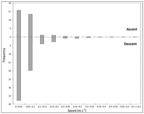 Frequency distribution of vertical speed during ascent and descent of reef manta rays (Mobula alfredi) (n = 3) recorded using pop-up satellite tags (SPLASH10 and MiniPAT) in New Caledonia.