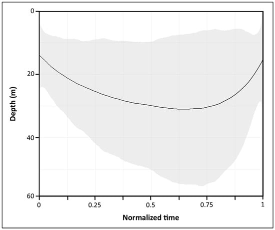 The mean dive profile of all dives combined, expressed over normalized time, remained shallow in average at approximately 30–35 m, and showed a characteristic U-shaped pattern (Figure 6). Yet, variation among dives was considerable, with deeper dives tending to follow a more V-shaped profile, while shallower dives were more distinctly U-shaped. In addition, as depth increased, dives tended to be slightly skewed to the right, indicating a slower descent phase followed by more rapid ascents.