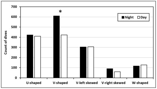 Diel distribution of shapes of dives (n = 2869) performed by reef manta rays (Mobula alfredi) (n = 3) recorded from pop-up satellite tags (SPLASH10 and MiniPAT) in New Caledonia. * indicates significant difference between day and night (p < 0.01).