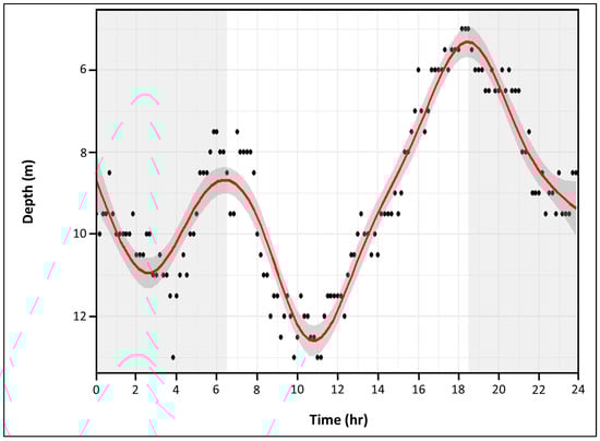 When data from all individuals were combined, depth use was not uniform but showed cyclic fluctuations aligned with time of day (Figure 8). Over a 24 h period, median swimming depths ranged from approximately 5 to 13 m and revealed a clear diel pattern. Manta rays occupied shallower depths around dawn and dusk (6–8 m), and deeper depths around midday (up to ~13 m).