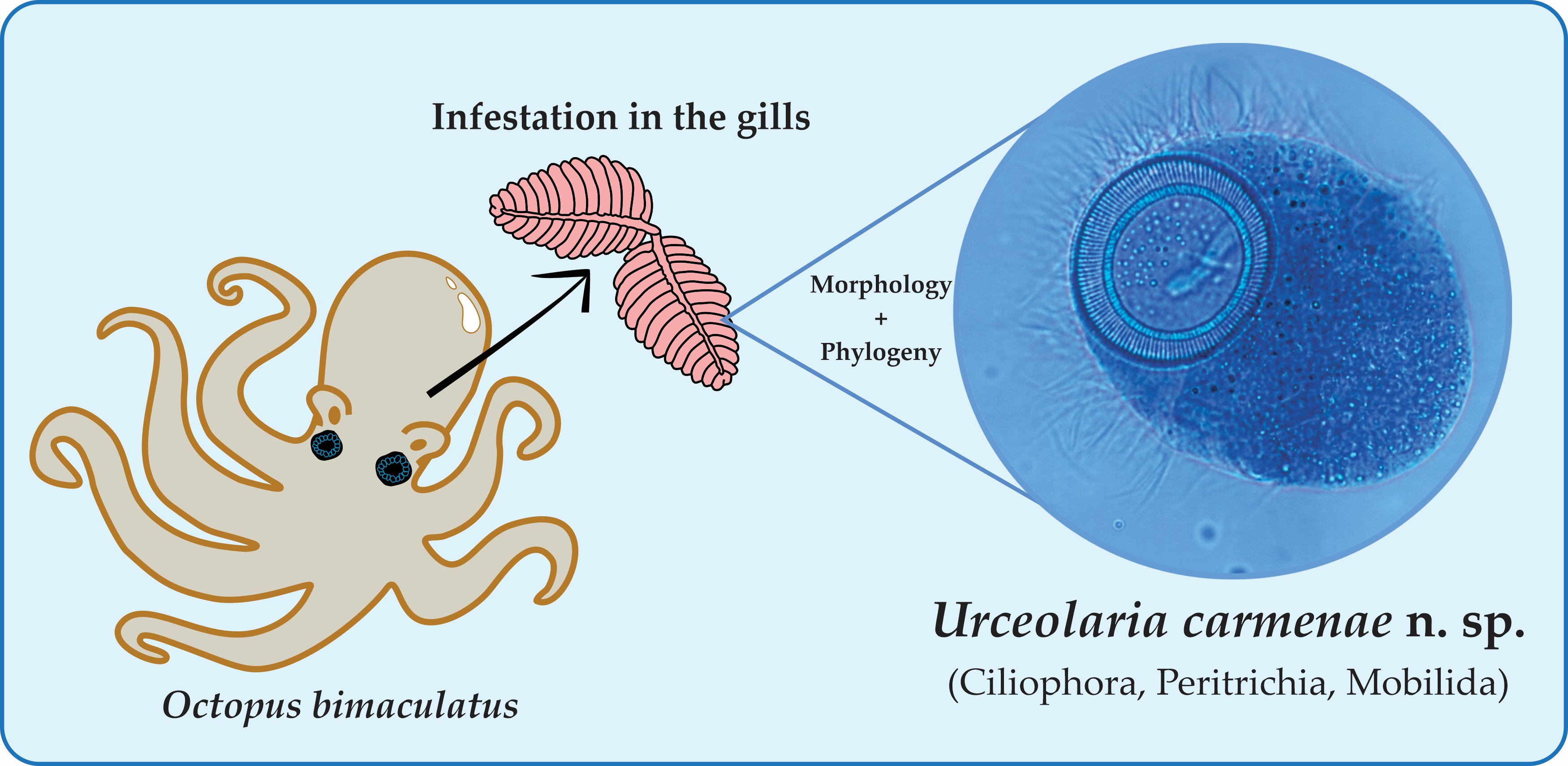 Colunga-Ramírez GE, Castellanos-Martínez S. First Record of Urceolaria carmenae n. sp. (Ciliophora, Peritrichia, Mobilida) Infesting the Gills of Octopus bimaculatus Verrill from the Gulf of California, Mexico. Fishes. 2025; 10(11):553. https://doi.org/10.3390/fishes10110553