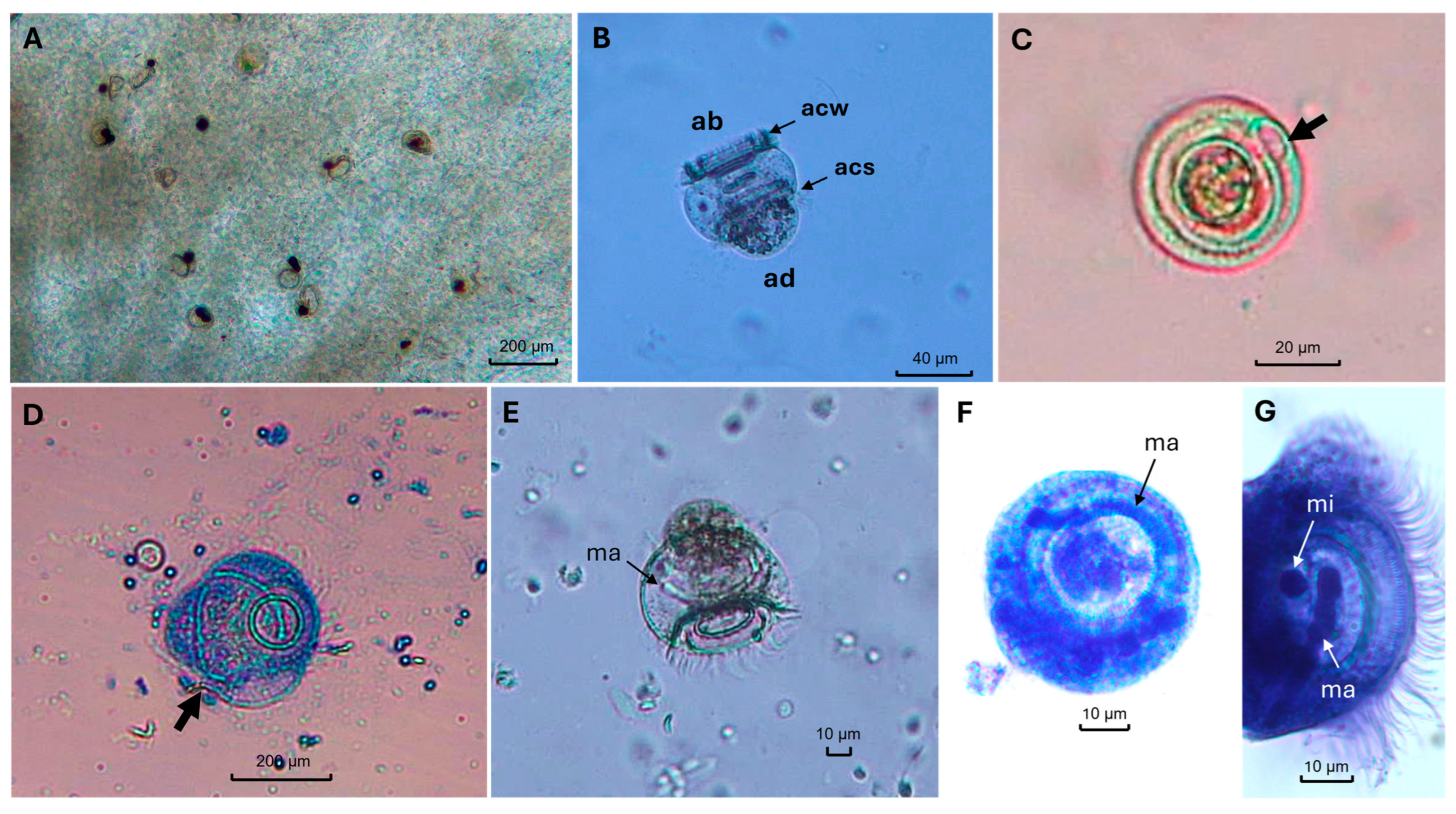 - Xu, K.; Song, W.; Warren, A. Observations on trichodinid ectoparasites (Ciliophora: Peritricha) from the gills of maricultured molluscs in China, with descriptions of three new species of Trichodina Ehrenberg, 1838. Syst. Parasitol. 2000, 45, 17–24. [Google Scholar] [CrossRef]