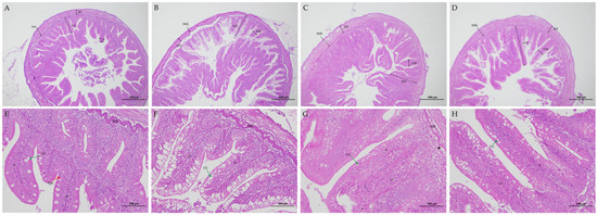 For each biological replicate, four rainbow trout intestinal segments free of alimentary canal contents were randomly selected and fixed in Bouin’s fixative (Xinyu Biochemical Co., Ltd., Shanghai, China). They were subsequently rinsed repeatedly with distilled water to remove residual fixative and then transferred to 70% ethanol (CAS 64-17-5, Runjie Technology Development Co., Ltd., Shanghai, China), for gradient dehydration until the ethanol remained colorless. The dehydrated midgut segments were embedded via conventional paraffin infiltration. Paraffin-embedded samples were sectioned into 4 μm thick slices using a microtome (Model MD400B, Leica, Wetzlar, German). After deparaffinization and rehydration, the sections were stained with hematoxylin-eosin (HE, Solarbio Science & Technology Co., Ltd., Beijing, China) and mounted with neutral balsam. In each experimental group, 30 midgut intestine sections were observed under a light microscope (Echo Revolve, Chicago, IL, USA). Villi height (VH), villus width (VW), and muscle layer thickness (MT) in the midgut of rainbow trout were measured by ImageJ (Java8, National Institutes of Health, Bethesda, MD, USA) [13].