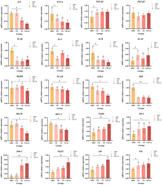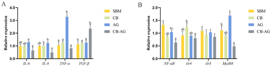 As shown in Figure 8, AG displayed significantly higher expression of pro-inflammatory genes like TNF-α, NF-κB, and MyD88 compared to SBM (p < 0.05). In contrast, CB-AG exhibited markedly lower expression of pro-inflammatory factors, including IL-6, IL-8, NF-κB, TLR4, and MyD88, relative to SBM, while concurrently showing significantly increased expression of TGF-β (p < 0.05).