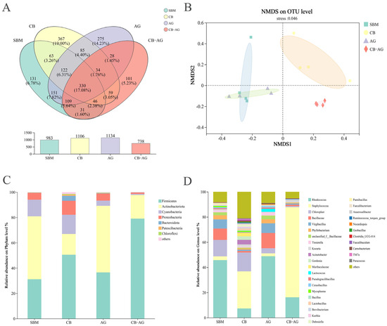 From 24 sequenced samples, the Illumina NextSeq2000 platform generated an average of 52,474 sequences per sample, yielding 526,952,601 high-quality sequences. Sequence lengths ranged from 205 to 540 bp, with a mean length of 418 bp. Venn diagram analysis was employed to assess the similarities and overlaps of OTUs across the different groups. The four groups shared 330 core OTUs, while the number of unique OTUs per group was 653 (SBM), 776 (CB), 804 (AG), and 408 (CB-AG), respectively (Figure 3A).
