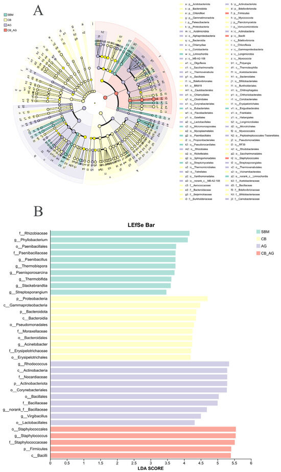 We conducted LEfSe analysis (Figure 4A) on the four groups and identified Phyllobacterium, Paenibacillus, Thermobispora, Paenisporosarcina, Thermobifida, and Stackebrandtia as the genus-level biomarkers in the non-supplemented diet (SBM). Proteobacteria and Bacteroidota were the phylum-level biomarkers in a 0.10% C. butyricum-supplemented diet (CB). Acinetobacter was the genus-level biomarker in CB. Rhodococcus, norank-f-Bacillaceae, and Virgibacillus were the genus-level biomarkers in a 0.10% Ala Gln-supplemented diet (AG). Actinobacteriota was the phylum-level biomarker in AG. Staphylococcales was the genus-level biomarker in CB-AG. Firmicutes was the phylum-level biomarker in CB-AG (Figure 4B).