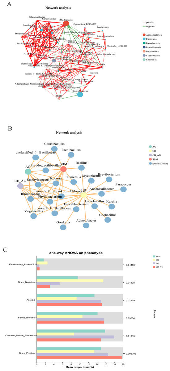 Network interaction graph for hindgut microbial communities at the genus level, using wTO network analysis (A,B). BugBase phenotype prediction of the gut microbiota in rainbow trout (C). Line color indicates correlation type: red for positive, green for negative. Thickness shows correlation strength, with thicker lines meaning stronger correlations. More lines signify closer species connections. ** represents extremely significant (p < 0.01), * represents significant (p < 0.05), and blank represents not significant (p > 0.05).