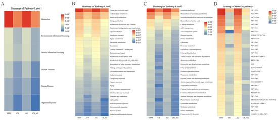Predictive metagenomic analysis of rainbow trout fecal microbiota functional profiling. Bacterial gene functions were predicted from the 16S rRNA gene-based microbial compositions using the PICRUSt2 algorithm and inferences from KEGG databases. Heatmap of pathway level1 (A), pathway level2 (B), pathway level3 (C) and MetaCyc pathway (D) in the gut microbiota of rainbow trout.