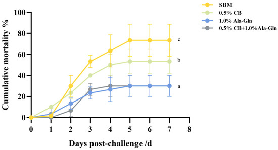 Effect of C. butyricum and Ala-Gln supplementation on survival against bacterial infection. Values within the same column bearing distinct superscript letters differ significantly (p < 0.05).