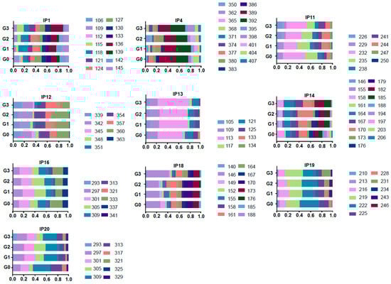 To examine changes in stock genetic structure during breeding, allele frequencies were calculated for all loci across the four generations (Figure 1; Table S3). The dynamics of allele frequencies could be broadly categorized into four patterns: (1) progressive increase, as in IP1-115, IP4-398, IP11-226, IP12-357, IP14-182, IP16-313, IP19-231, and IP20-293, which were initially rare but gradually became dominant; (2) progressive decrease, as in IP1-142, IP13-125, IP14-176, IP18-149, and IP19-228, which were common in G0 but declined sharply or disappeared in later generations; (3) relative stability across generations, such as IP4-392, IP11-241, IP13-113, IP16-301, and IP20-309; and (4) random fluctuations across generations, such as IP1-118, IP4-380, IP12-342, IP14-185, and IP20-305. In addition, many low-frequency alleles, such as IP14-188, IP14-206, IP4-386, IP13-133, IP19-228, and IP20-329, were gradually lost during the breeding process.