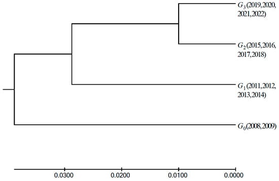 To further evaluate genetic differentiation, Nei’s genetic identity and genetic distance were calculated among the four generations (Table 3). Values of genetic identity ranged from 0.920 to 0.980, while genetic distances ranged from 0.012 to 0.061. The largest distance was between G0 and G3, which also showed the lowest genetic identity, whereas the smallest distance was between G2 and G3, which showed the highest identity. These results suggest more frequent gene flow between G1 and G2 compared with other generation pairs.