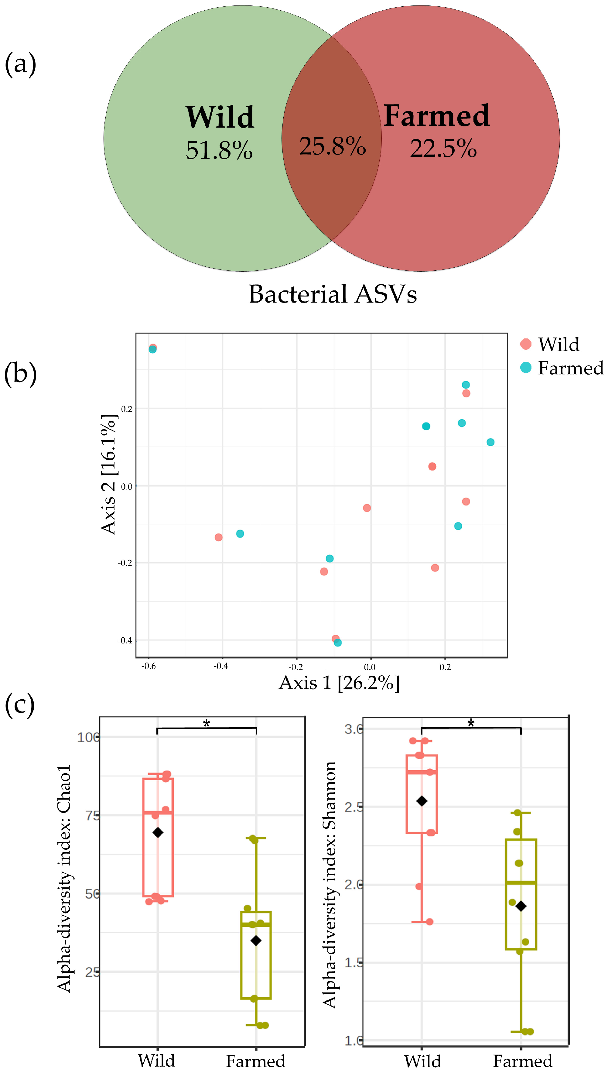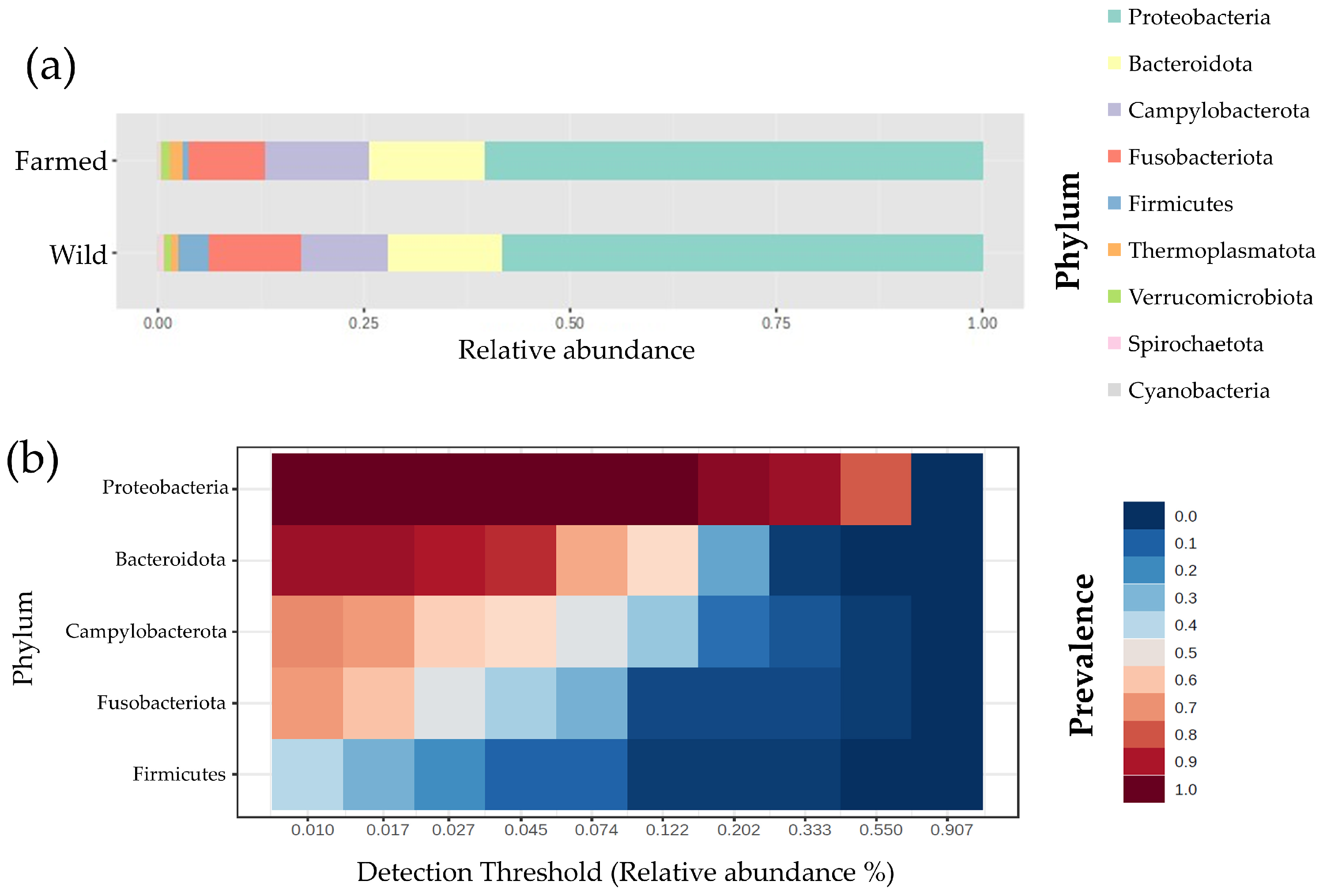 - Soh, M.; Tay, Y.C.; Lee, C.S.; Low, A.; Orban, L.; Jaafar, Z.; Seedorf, H. The intestinal digesta microbiota of tropical marine fish is largely uncultured and distinct from surrounding water microbiota. NPJ Biofilms Microbiomes 2024, 10, 11. [Google Scholar] [CrossRef] [PubMed]