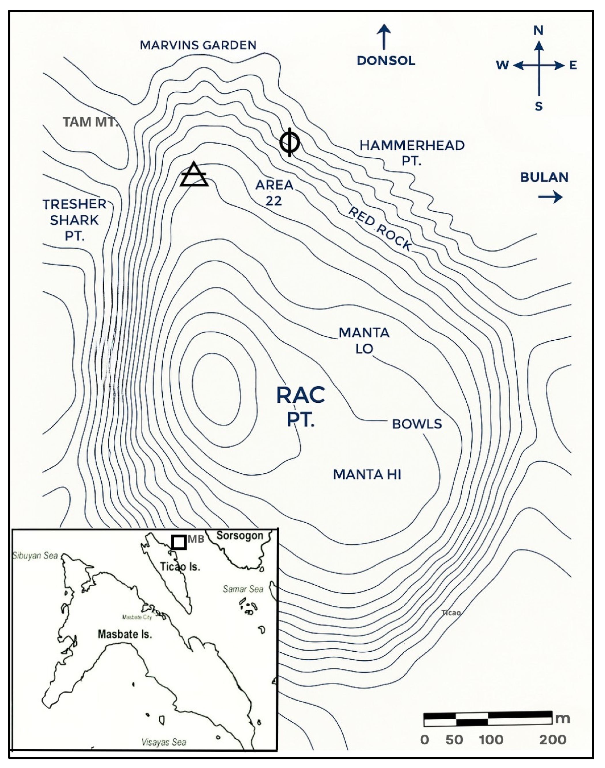 The present study was conducted at a submerged reef known as “Manta Bowl” (12.6597° N, 123.7550° E), located on top of a seamount (ca. 0.4 km
