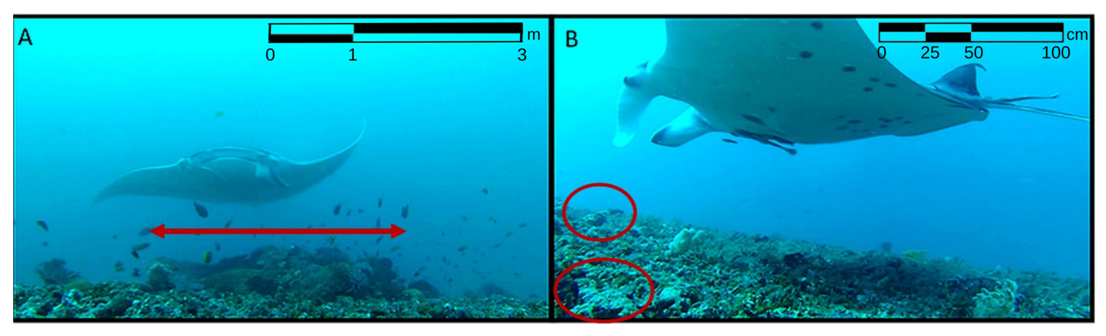 It is suggested that body size may contribute to the observed dominance. Reef manta rays can reach disk widths of at least 490 cm [