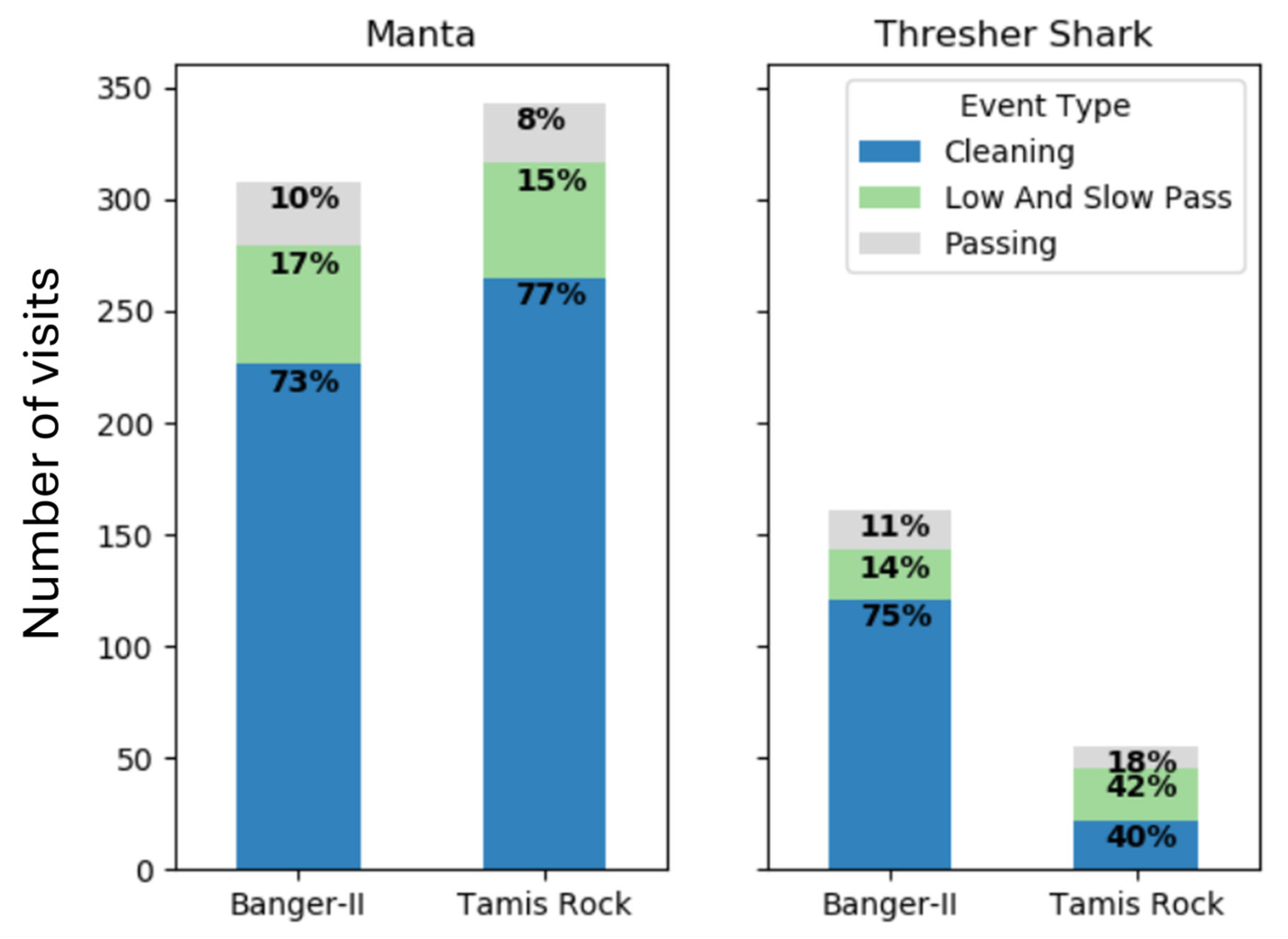 A total of 651 manta visits and 216 thresher shark visits were documented between the two cleaning stations (