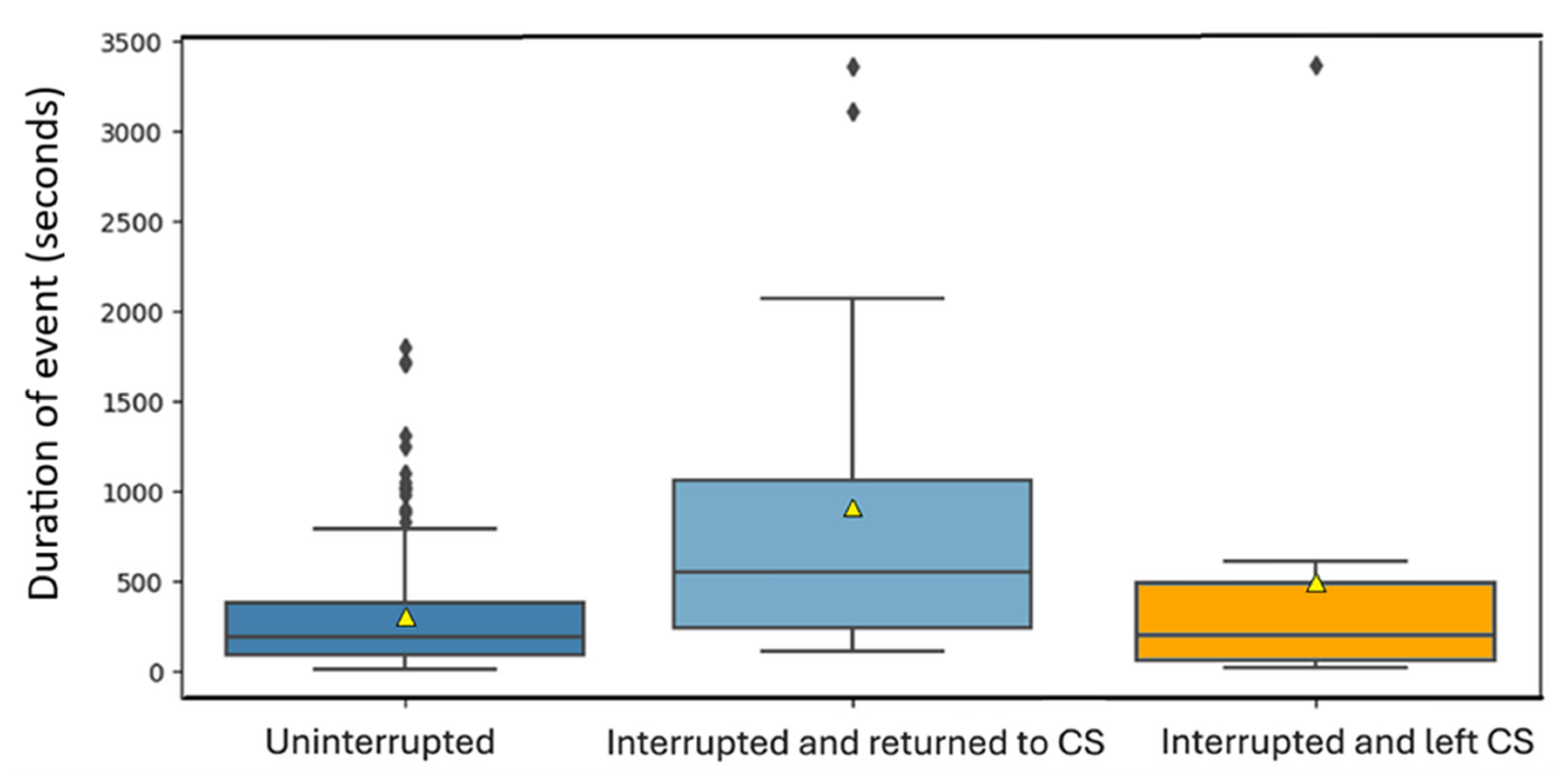 6]. When the initial client was not replaced, event duration increased, likely because the cleaning individual had to chase away the approaching animal before returning, reducing cleaning efficiency.