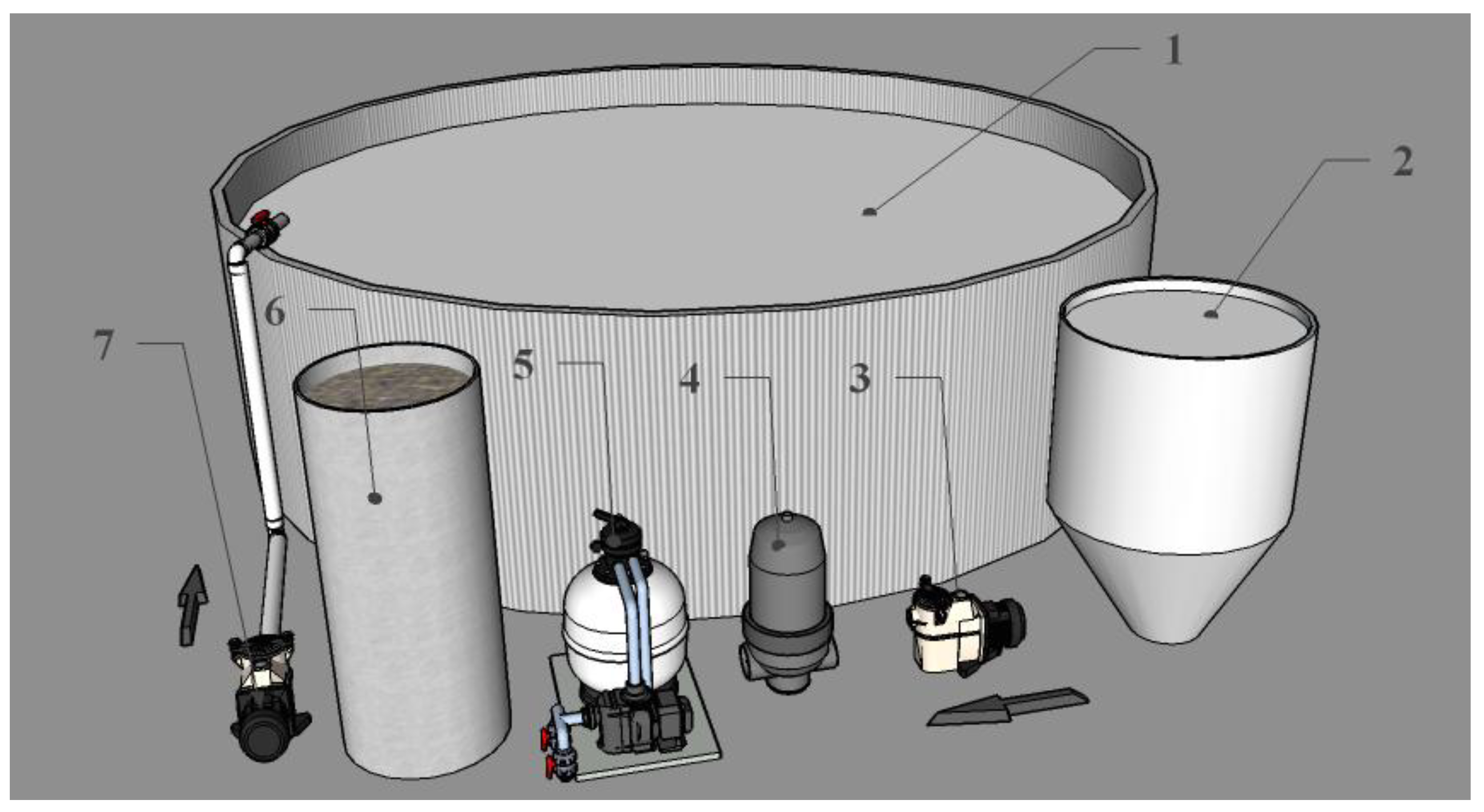 - Timmons, M.B.; Ebeling, J.M.; Piedrahita, R.H. Acuicultura En Sistemas de Recirculación; Cayuga Aqua Ventures: New York, NY, USA, 2009. [Google Scholar]