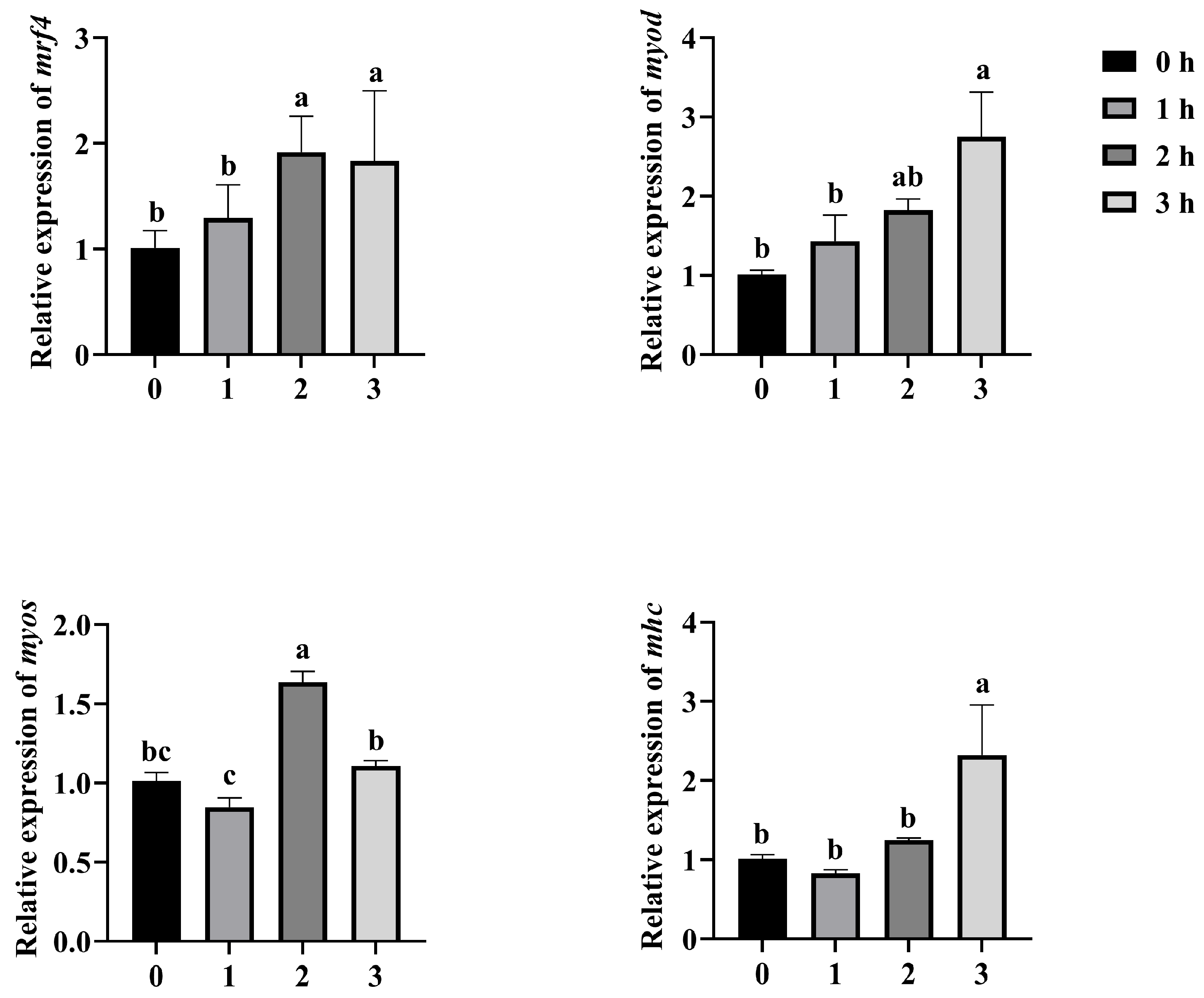 As shown in Figure 3, HRW treatment significantly impacted the expression of muscle growth-related genes in mandarin fish. The relative expression levels of the mrf4 and myos genes reached their maximum in the 2 h HRW treatment group, while no significant difference in mrf4 expression was noted between the 2 h and 3 h HRW treatment groups. Moreover, the relative expression levels of the myod and mhc genes in the 3 h HRW treatment group were significantly elevated compared to those in the control group (p < 0.05).