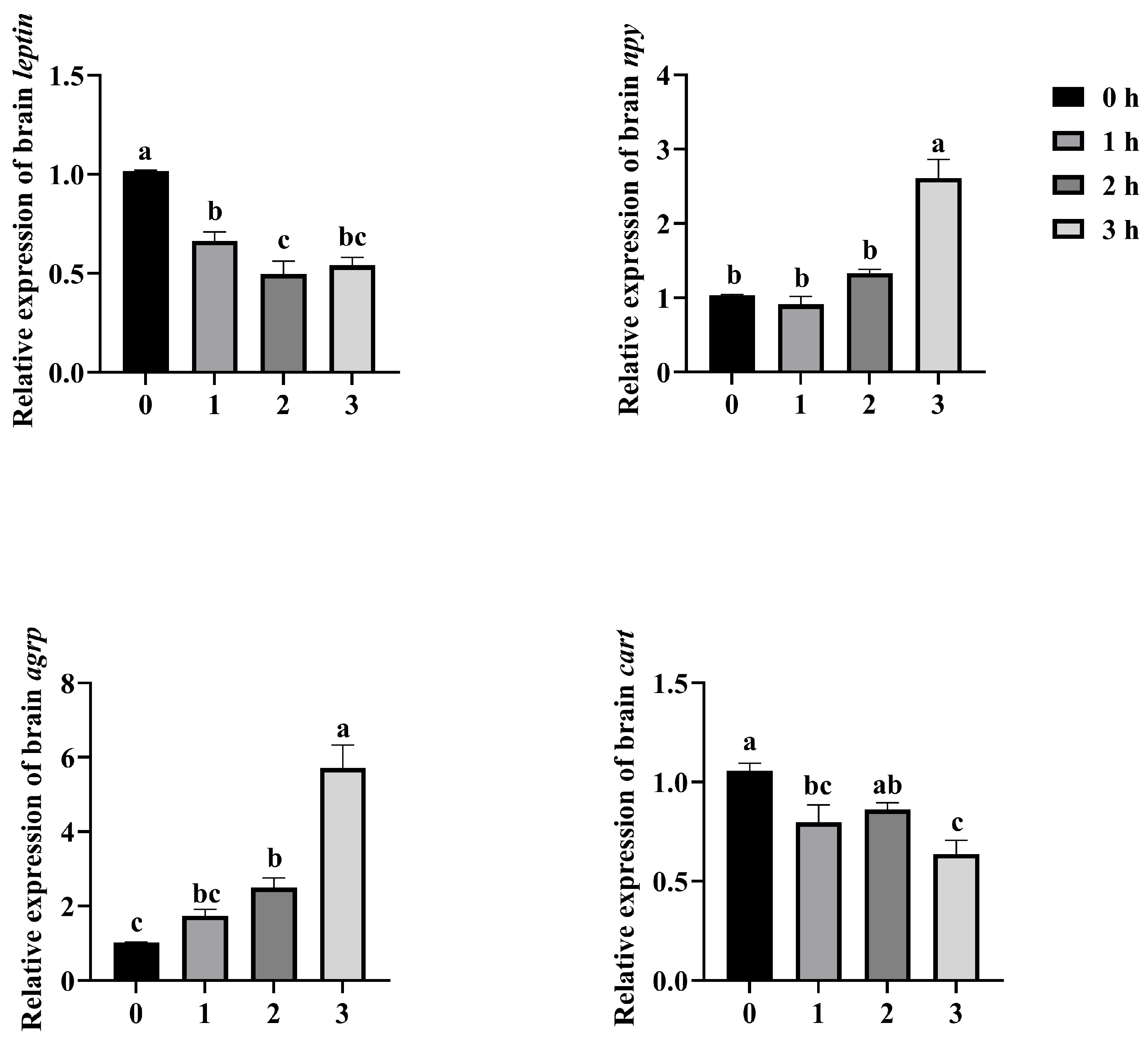 As shown in Figure 4, HRW treatment exerted a significant effect on the expression of appetite-related genes in the brain of mandarin fish. The relative expression of leptin mRNA in the three HRW treatment groups was significantly diminished in comparison to that in the control group (p < 0.05). Among all groups, the 3 h HRW treatment group exhibited the highest expression levels of npy and agrp. Furthermore, the relative expression of cart in the 3 h HRW treatment group was significantly reduced compared to that in the control group (p < 0.05).