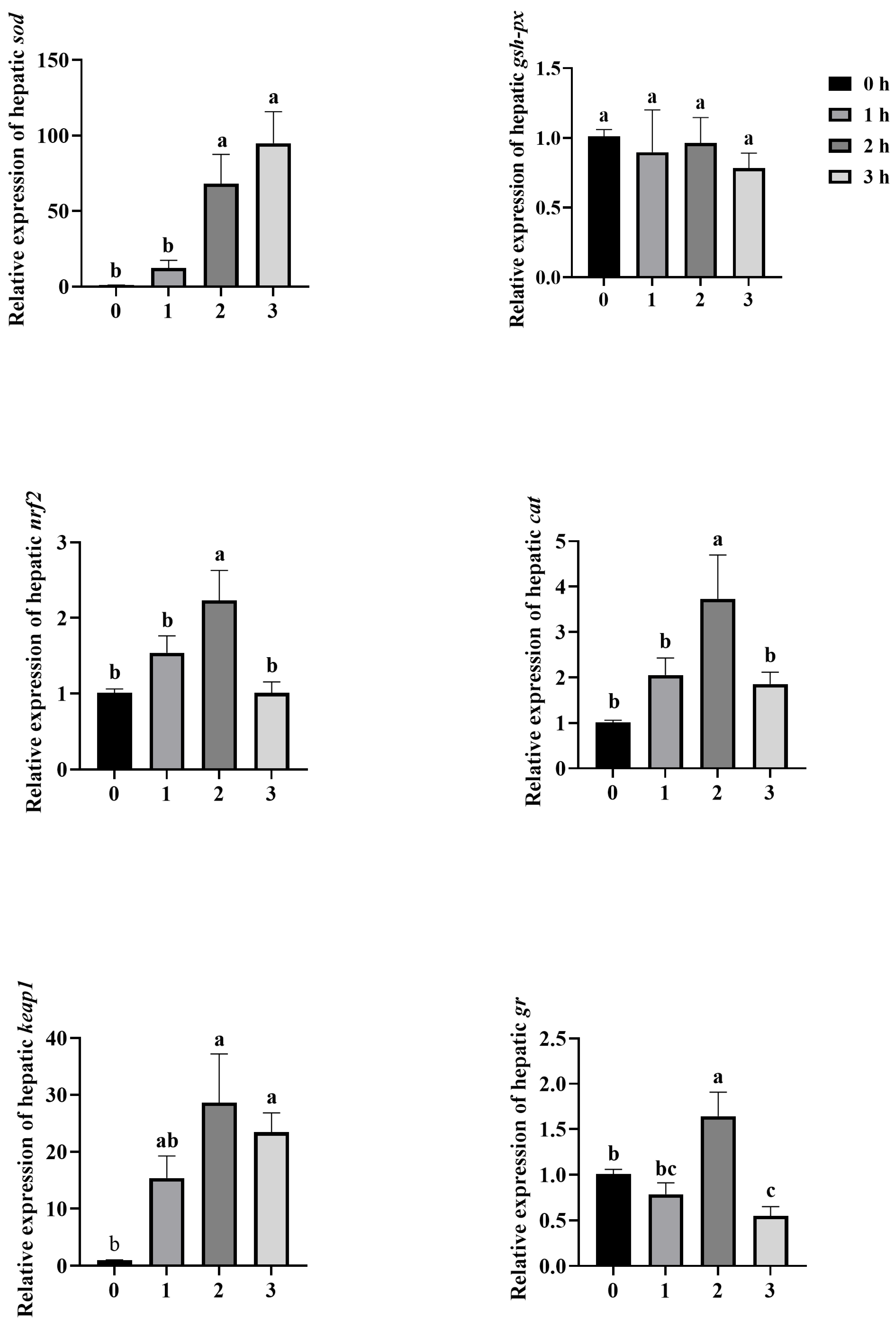 Figure 5. Relative expression of antioxidant genes in liver. Values are means ± SEM of three replicate groups with 3 fish in each group (n = 3). Values within the same rows having different superscripts are significantly different (p < 0.05). sod: superoxide dismutase; gsh-px: glutathione peroxidase; nrf2: nuclear factor erythroid factor 2; cat: catalase; keap1: ECH-associated protein 1b; gr: glutathione reductase.