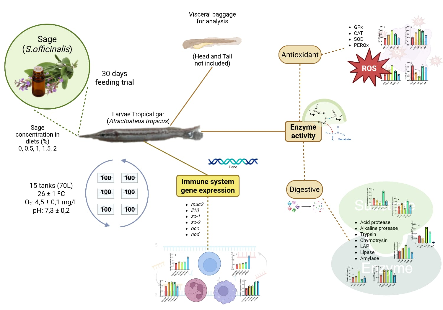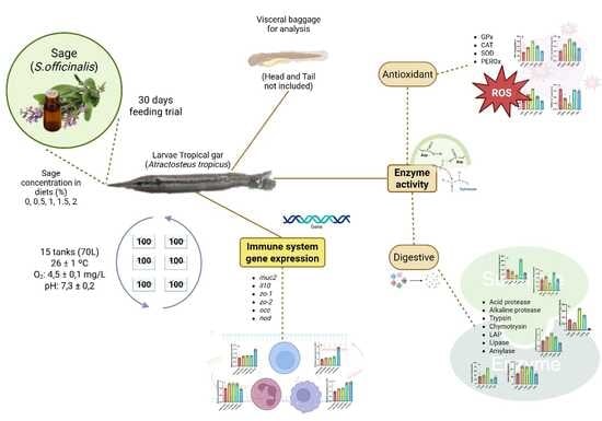 Jiménez-León, Y.; Jiménez-Martínez, L.D.; De La Rosa-García, S.; Sepúlveda-Quiróz, C.A.; Martínez-García, R.; Pérez-Jiménez, G.M.; Méndez-Marín, O.; Asencio-Alcudia, G.G.; Álvarez-González, C.A. Supplementation of Sage (Salvia officinalis) Essential Oil in Balanced Diets for Tropical Gar (Atractosteus tropicus) Larvae on Digestive and Antioxidant Enzyme Activities and Expression of Immune System Genes. Fishes 2025, 10, 586. https://doi.org/10.3390/fishes10110586