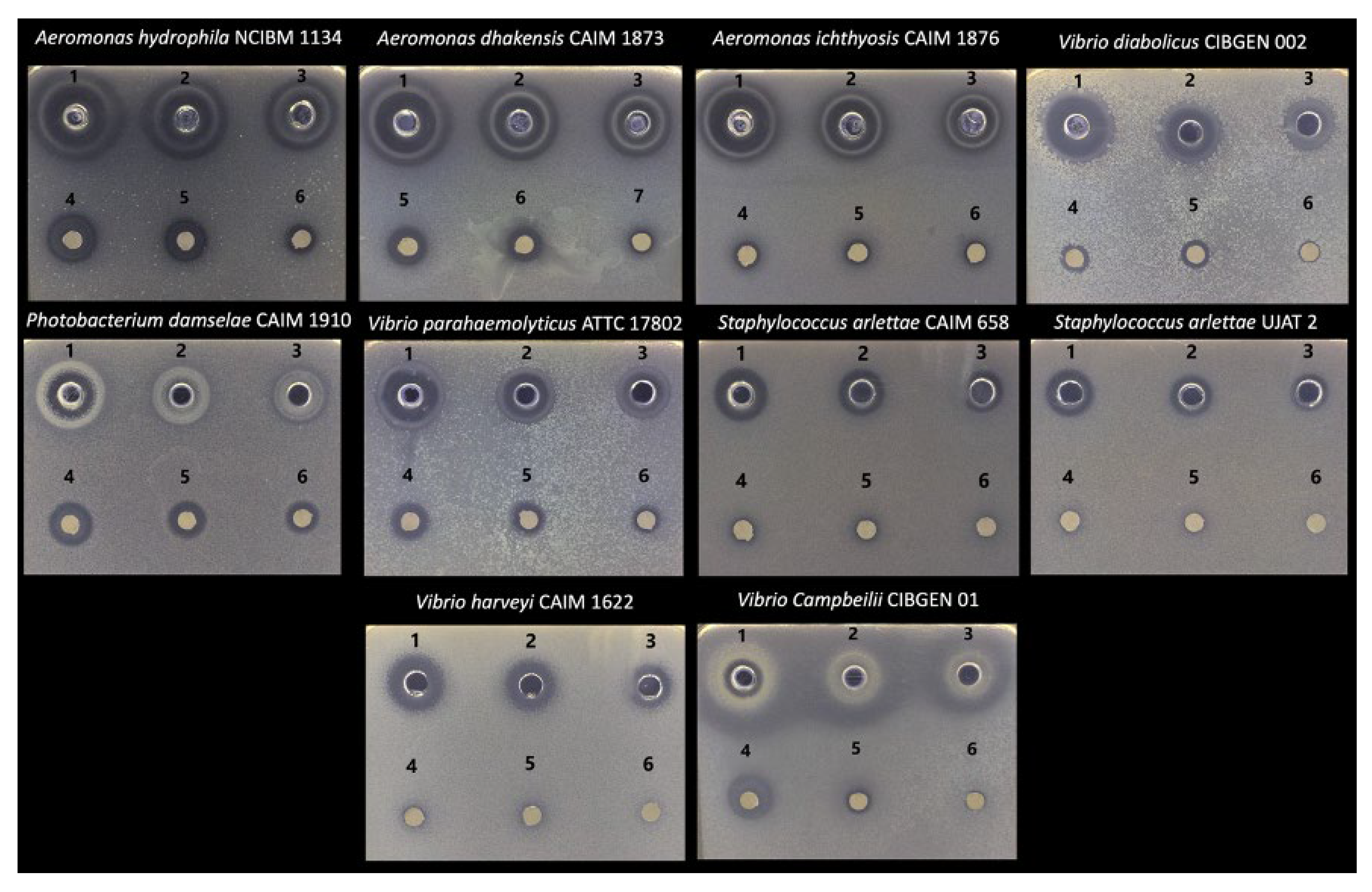 | CAIM 1910 | Photobacterium damselae | 17.97 | 16.12 | 14.42 | 14.45 | 12.60 | 11.17 |