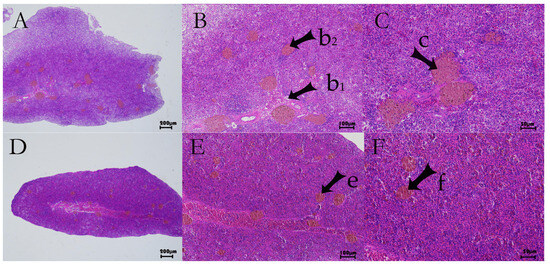 Histopathological changes in largemouth bass spleen after S. putrefaciens injection. (A–C) Spleen of control fish (saline injection). (D–F) Spleen of infected fish. Melanin-like pigment deposits (brown granules) are present in both groups (arrows b, c). Infected spleens show slightly reduced red pulp erythrocyte density (arrows e, f) and occasional cellular necrosis (indicative of tissue damage).