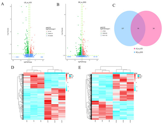 Differentially expressed genes (DEGs) in largemouth bass liver and spleen in response to S. putrefaciens infection. (A,B) Volcano plots of gene expression changes in (A) liver (LIS vs. LICS) and (B) spleen (SIS vs. SICS). Each point represents a gene; red points indicate significantly up-regulated DEGs and green points indicate significantly down-regulated DEGs (FDR < 0.05, |log2FC| > 1); the horizontal dashed line indicates the statistically significant threshold (padj < 0.05). (C) Venn diagram of DEGs in liver and spleen comparisons, showing the overlap of 198 DEGs common to both tissues and the large number of DEGs unique to spleen. (D,E) Heatmaps of DEGs for liver (D) and spleen (E) samples, illustrating distinct clustering of infected vs. control groups and overall expression patterns.