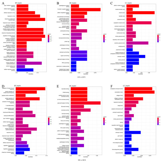GO enrichment analysis was performed to identify the biological processes, molecular functions, and cellular components significantly associated with the DEGs. In the liver (LIS vs. LICS DEGs), immune-related GO terms were prominently enriched. The two most significant Biological Process (BP) terms were “type I interferon signaling pathway” and “cellular response to type I interferon”, indicating strong activation of interferon-mediated antiviral responses in the liver (Figure 4A). The BP terms with highest enrichment ratios (fold enrichment) were “response to molecule of bacterial origin” and “regulation of innate immune response”, suggesting that liver DEGs are heavily involved in recognizing bacterial components and modulating innate immunity. In the Molecular Function (MF) category, the top two significant terms were “peptidoglycan muralytic activity” and “G protein–coupled receptor binding”, with the latter also being the most enriched MF term overall, reflecting roles in pathogen recognition and signaling. In the Cellular Component (CC) category, the most significant terms were “clathrin-coated endocytic vesicle” and “alveolar lamellar body”, while the most enriched CC term was “vesicle lumen”. These CC enrichments suggest involvement of intracellular vesicular structures, possibly related to endocytosis and secretion, in the liver’s response.
