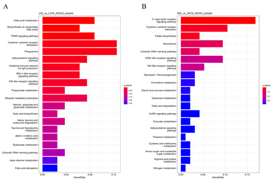 Top 20 enriched KEGG pathways among DEGs in (A) liver (LIS vs. LICS) and (B) spleen (SIS vs. SICS). The x-axis indicates the Rich Factor (ratio of DEG count to total gene count in each pathway), and point size reflects the number of DEGs in that pathway. Point color denotes the statistical significance (adjusted p-value). In liver (A), metabolic pathways like fatty acid metabolism and unsaturated fatty acid biosynthesis are significantly enriched, alongside immune pathways like cytokine–receptor interactions and phagosome. In spleen (B), immune pathways dominate: C-type lectin receptor signaling and cytokine–cytokine receptor interaction are both highly enriched and significant, indicating a strong immune activation in splenic tissue.